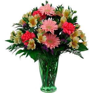 Send some warm, refreshing vibes with this meadow-inspired bouquet of pink Gerberas, hot pink or fuchsia carnations, yellow alstroemerias, rich purple iris and mixed greenery arranged. Vase no including.