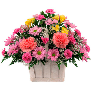 Celebrate Easter with this lovely, handled flower basket arrangement of pink carnations and daisies, freesia, baby's breath and greenery.