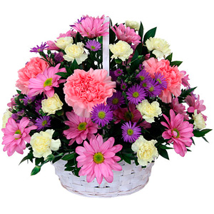 Send your best salutations with this colourful floral basket in pink, mauve, purple, featuring daisies, carnations and asters. An affordable, easy to give gift for Easter or any occasion