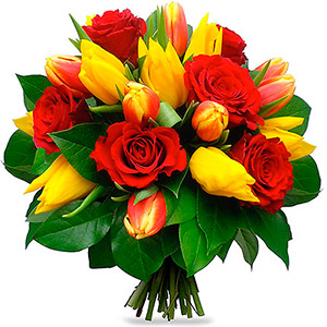 Passionate bouquet of red roses and tulips will pass even the most ardent senses of love! Hurry up to declare your love on the day of St. Valentine's in a beautifully and exquisitely way! Important! European bouquet it's a style! Size and length doesn't matter in this bouquet. The most important thing is its content. You give your beloved a floral masterpiece and nothing distracts attention from the beauty of the lovely creatures of nature. Composition: 8 red roses, 17 red and yellow tulips, greenery, decoration.