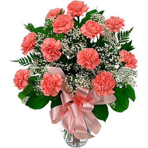 Pink Carnations. One dozen long lasting and popular pink carnations with added baby's breath and greens, arranged in a glass vase with matching pink bow.