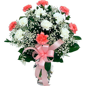 Pretty Carnations. Say "Thank-you" with this long-lasting vase arrangement of pink and white carnations with baby's breath, presented with a matching bow.