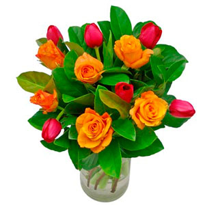 A cheerful hand-tied bouquet of winter tulips and roses nestled in a bed of lush foliage. This delightful bouquet will warm the winter chills. Flowers Include: Short 6 roses and 7 tulips in a bouquet.