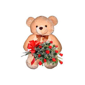 Roses & Large Bear. Bouquet of 11 long stemmed red roses and a large Teddy Bear. Teddy Bear may vary