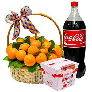 Positive set of a festive mood - surprise your beloved! Сomposition: a box of chocolates "Raffaello" - 150 gr., a bottle of drink "Coca-Cola" - 1.5l. basket of oranges. (Basket can be replaced with the same type, in case of absence of this model in stock. Baskets are delivered in a transparent cellophane packaging.) Weight of fruits: 3 kg