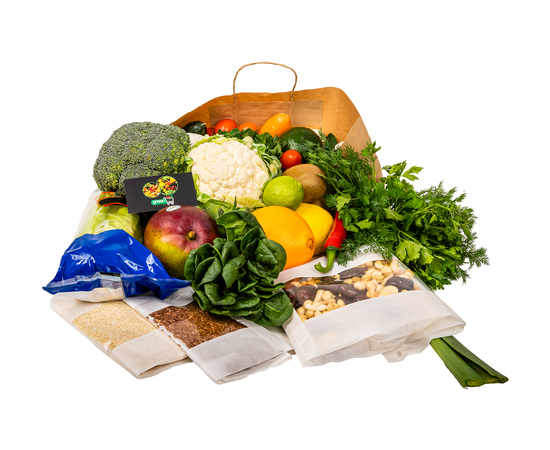 Banana 1kg -Apples Golden 3pcs. -Avocado 1pc. -Cucumbers 500g. - Celery stalk 1pc. -Spinach 100g - Zucchini 1pc. - Cauliflower 1pc. -Lemon 1pc / Lime 1pc. -Mint 50g.-Mix of nuts and dried fruits: Cashews 100g., Hazelnuts 100g., Raisins 100g., Dates 100g. -Broccoli 1pc. -Salad Mix 1pc. -Carrots 3pcs. -Garlic 100g. -Leek 1pc. -Mango 1pc. - Flax seeds 50g. / Sesame seeds 50g. -Mushrooms 500gr. -Cherry tomatoes 500g.-Ginger root 100gr. -Red onion 200g. -Kiwi 2pcs. -Pepper Capi 1pc. -Dill 50g. / Parsley 50g. -Orange 1pc.