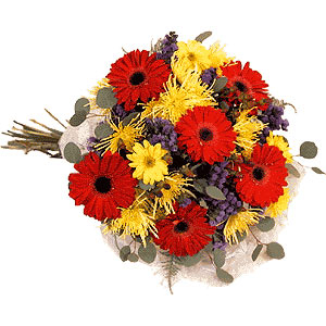A bright, festive hand-tied bouquet of fresh cut, long lasting flowers including gerbera, spider mums, daisies and statice.You can add your personalized card message to the bouquet arranged by our local Florist at the checkout page too.