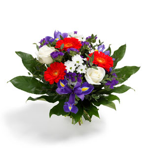 A stand-out grouping of bright red Gerberas, deep blue irises and white roses partnered with aromatic eucalyptus! (3 White roses + 2 White daisies + 3 Red Gerberas + 5 Purple irises + Greens) You can add your personalized card message to the bouquet arranged by our local Florist at the checkout page.
