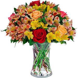 Gorgeous of 1/2 dozen assorted colour roses with several stems of many-bloomed, assorted colour alstroemeria. A full, colourful arrangement that's a panoramic display for the senses. Vase no uncluding. (6 Mixed roses + 9 Mixed Alstromeria )