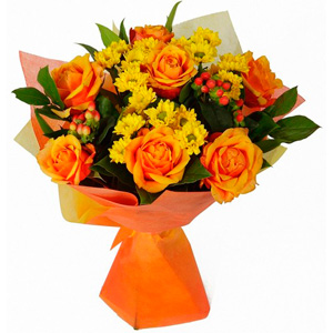 Bouquet of 7 orange roses, 4 yellow chrysanthemums, 3 red Hypericum and greenery.