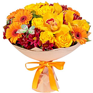 Intense shades of wonderfully fragrant flowers give a bright and positive feelings! Present such an original gift for dear person - your present will be too much appreciated by your recipient! Composition: 5 yellow roses, 5 orange gerberas, 3 red branches chrysanthemums, 3 yellow orchid, decorations.