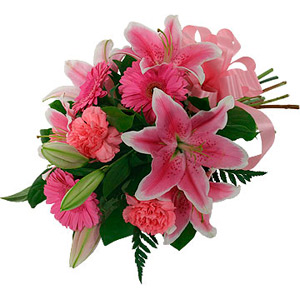 Pink on Pink. Send her this wonderfully feminine bouquet of pink blooms, featuring fragrant Stargazer lilies, hot pink Gerbera daisies, and long lasting pink carnations. This combination is expertly crafted with just the right amount of greenery - it's wrapped - and it's tied with a matching pink bow.  (3 branches of  Pink lilies + 3 Pink Carnation + 3 Pink Gerberas + Greens)