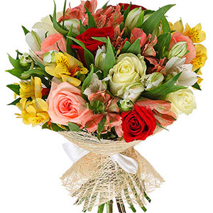 A nice bouquet with a variety of pink, yellow and Lilies.(4 White roses + 5 Pink roses + 5 Red roses+ 3 Pink Alstromeria + 3 Yellow Alstromeria + 3 White Alstromeria +  2 branches of  white lilies +  Greens) You can add your personalized card message to the bouquet arranged by our local Florist at the checkout page.