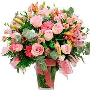Delicate soft feminine colours for your delicate soft female. Celebrate your ladys gentleness and femininity with this beautiful arrangement, set in a glass vase to make the perfect gift. (3 branches of  Pink Lilies + 6 Pink Gerberas + 6 Pink Alstromeria + 11 Pink roses + Greens) You can add your personalized card message to the bouquet arranged by our local Florist at the checkout page too.