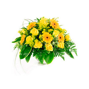 A real summer Sunshine of gold and yellows with this bouquet of gerbera daisies, chrysanthemums and roses. (11 Yellow roses + 6 Yellow Gerberas + 6 Yellow Chrysanthemus + Greens) You can add your personalized card message to the bouquet arranged by our local Florist at the checkout page.