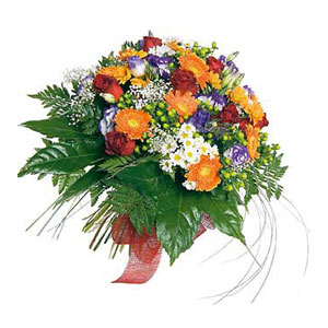This bouquet of mixed cut flowers arranged from 7 red roses, 7 orange gerberas, 5 purple lisianthus, 3 White daisies and greenery - arrives hand-tied and ready for the recipient's favorite vase. A glass vase is optional.You can add your personalized card message to the bouquet arranged by our local Florist at the checkout page.