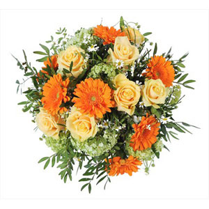 Send your congratulations today with this bright arrangement of stunning fresh flowers: orange gerberas, cream roses and complementary greens. ( 7 Orange Gerberas + 8 Cream roses + Greens) You can add your personalized card message to the bouquet arranged by our local Florist at the checkout page too.