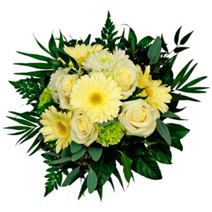Send wishes for a wonderful holiday season with this magnificent White Bouquet, remembering the snowflakes of a magic winter day. (5 roses + 5 Gerberas + 3 green Chrysanthemus + Greens) A glass vase is optional.