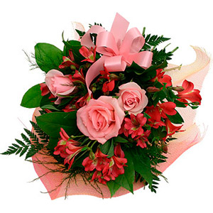 Lovely, feminine wrapped bouquet of 3 or more pink roses with pink or red alstroemerias, assorted greens and matching bow. A simple, affordable flower gift, perfect for sharing with friends. (3 Pink roses + 6 Red (Pink) Alstromeria + Greens) You can add your personalized card message to the bouquet arranged by our local Florist at the checkout page.