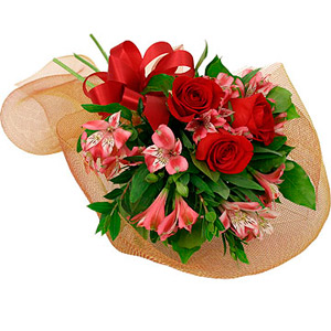 Romantic wrapped fresh flower bouquet of 3 red roses with pretty 4 pink alstroemerias, assorted greens and matching bow.You can add your personalized card message to the bouquet arranged by our local Florist at the checkout page.