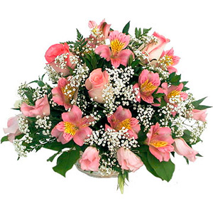 Beautiful rounded arrangement in pink tones, made with roses, alstroemerias, lisianthus and baby's breath.(11 Pink roses + 6 Pink Alstromeria + Gypsophila + Greens) You can add your personalized card message to the bouquet arranged by our local Florist at the checkout page.