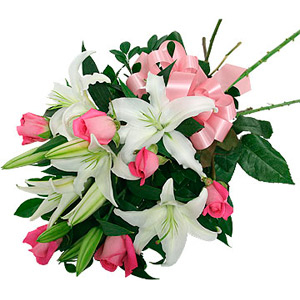 Pretty, feminine bouquet of pink roses with beautiful white lilies, wrapped and tied with a matching pink bow. (3 branches of white lilies + 7 Pink roses + Greens)You can add your personalized card message to the bouquet arranged by our local Florist at the checkout page.
