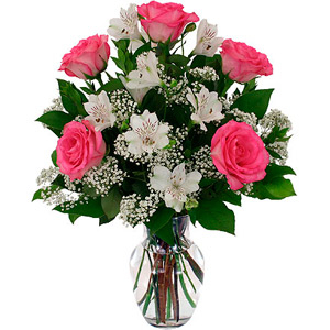 Show her your affectionate devotion with this delicate vase arrangement of 5 pink roses with 6 white alstroemerias and baby's breath. A lovely, original floral gift by Moldova Flowers. A glass vase may vary.You can add your personalized card message to the bouquet arranged by our local Florist at the checkout page.