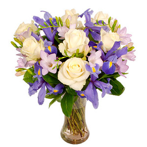 This is a lovely combination of delicate purple and white flowers. The iris will arrive in bud but will soon open to enhance the butterfly effect of the bouquet and the beautifully scented purple eustoma nestle amongst the pure white roses to make a magical bouquet. (7 White roses + 7 Purple irises + 7 Pink lisianthus )  A glass vase is optional.You can add your personalized card message to the bouquet arranged by our local Florist at the checkout page.