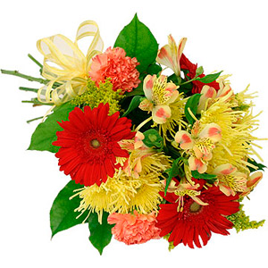 Pretty cut flower bouquet designed with alstroemerias, gerbera daisies, carnations and more. What a nice way to express yourself to a friend! (3 Red Gerberas + 3 Yellow Chrysanthemus + 3 Yellow Alstromeria + 3 Pink Carnation + Greens) You can add your personalized card message to the bouquet arranged by our local Florist at the checkout page.