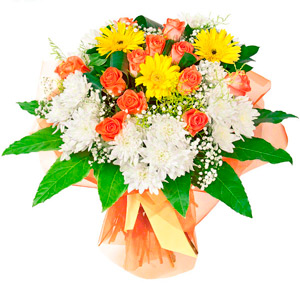Scarlet and golden rays of the sun make their way through the snow-white clouds of charming chrysanthemums bouquet. (11 Orange roses + 3 Yellow Gerberas + 5 White Chrysanthemus + Greens) You can add your personalized card message to the bouquet arranged by our local Florist at the checkout page.