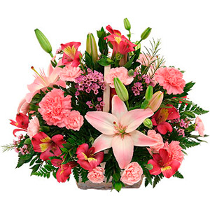 Pretty handled basket arrangement of assorted pink flowers. Featuring popular varieties of lilies, carnations, alstroemerias and wax flower.You can add your personalized card message to the bouquet arranged by our local Florist at the checkout page.