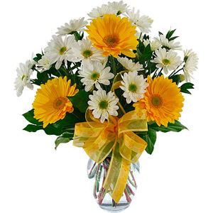 Clean, bright arrangement of white daisies and distinctive yellow or orange gerbera daisies, adorned with a matching yellow ribbon. ( 5 Yellow Gerberas + 6 White Chrysanthemus + Greens) A glass vase is optional.You can add your personalized card message to the bouquet arranged by our local Florist at the checkout page.