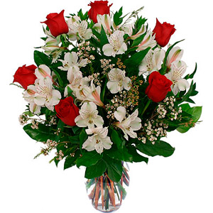 Inspire someone you care about today with this pretty arrangement of white, and red flowers in a glass vase and featuring white alstromerias, red roses. This design is completed with some delicate greenery and added flowering baby's breath.(7 Red roses + 8 White Alstromeria + Gypsophila + Greens) You can add your personalized card message to the bouquet arranged by our local Florist at the checkout page.