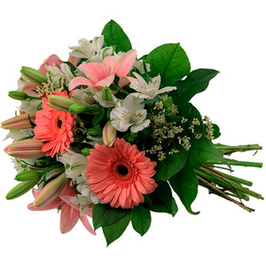 This pretty bouquet of white and pink blooms is a wonderful way to send your best wishes for a very happy day. Fresh flowers include 3 branches of pink lilies, 3 pink Gerbera daisies, 5 white alstroemerias and greens. A glass vase is optional.You can add your personalized card message to the bouquet arranged by our local Florist at the checkout page.