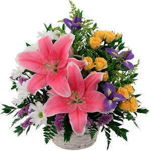 A pretty whitewash handled basket is arranged with beautiful pink lilies, groupings of yellow spray roses, as well as white daisies. Added are some purple Iris and colourful statice. (2 buds of Pink lilies + 3 White daisies + 3 Yellow spray roses + 4 Purple irises + 2 Blue Limonium + Greens) You can add your personalized card message to the bouquet arranged by our local Florist at the checkout page.