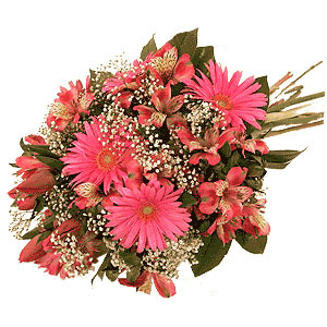 Pretty hand-tied bouquet of gerbera, alstroemeria and baby's breath. (3 Pink Gerberas + 6 Pink Alstromeria + Gypsophila+ Greens)You can add your personalized card message to the bouquet arranged by our local Florist at the checkout page too.