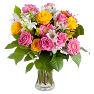 A round rose bouquet of 4 pink roses and 4 yellow roses, accented with 3 white alstroemeria, 4 pink gerbera, and greenery.
