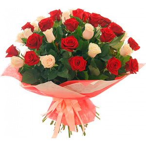 Nice, classical and stylish bouquet of 45 red and white roses in a luxury paper. 70cm.