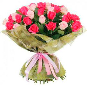 Enormous and lovely bouquet of 51 roses in pink shades, wrapped in luxury paper and tied with a right ribbon.