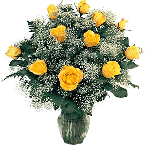 Pretty vase arrangement of one dozen yellow roses in a glass vase - pictured with added baby's breath.You can choose a quantity of roses if you wish to send an odd quantity of roses **