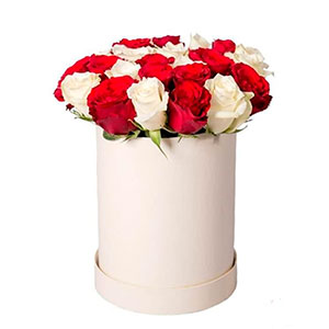 A beautiful Arrangement of 24 White and Red Roses in a round white elegant gift box. Perfect for Birthdays, anniversaries, Valentine's, Mother's day, new born baby girl celebration, graduation, get well and many more. Please note that due to stock availability the flower round gift box, vase or basket might slightly differ from the one in the image. However, the same color / look of equal or higher value will only be used.