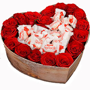 Heart of red roses and candies "Raffaello" - classic and always topical combination for congratulation on Valentine's Day!17 red roses, candies "Raffaello" - 16 pieces, decorative gift box (heart shaped) floral material. Recommended for such occasions: Birthday, For children, For her, For him, For mother, For young lady, Gratitude, I Miss You, Аnniversary.