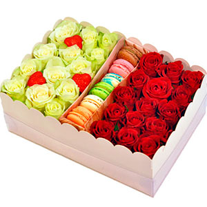 15 red roses, 14 white roses, cookies Macaron - 6 pcs, decorative gift box, floral material.