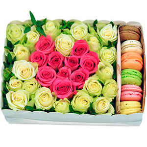 31 white and pink rose, 6 Macaron cookies, decorative gift box, floral material