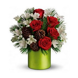 Christmas bouquet. The floral arrangement mixes white alstroemeria with red roses and pine is presented in an green cylinder vase.