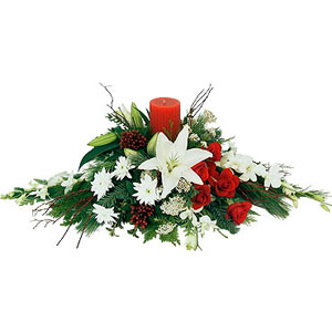 Christmas gift #7. Beautifully designed Christmas centerpiece arrangement of red roses, white lilies, mums and Christmas trimmings, including berries and pine... all surrounding a warm and inviting red pillar candle.