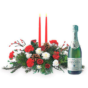 This Christmas gift with red candles, fresh flowers and pine, this decorative centerpiece will make any dinner even more delicious. Arrangement Details: Components May Vary - Carnations, chrysanthemums and roses, along with evergreens and holly, arrive with two red taper candles. & Sparkling wine.