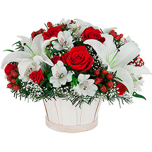 Dreamy white lilies with winter alstroemeria and delicate baby's breath combine beautifully with lush red roses, and red berries in this inspirational holiday reverie!