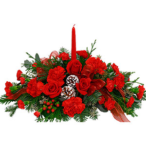Gorgeous Christmas centerpiece arrangement with all-red flowers, including roses, carnations. Accented with red berries, frosted pine cones and seasonal greens. A carefully crafted, florist designed Christmas gift.