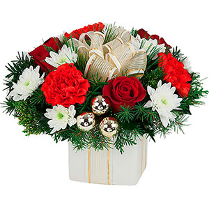 A golden ribbon wraps around and adorns this cubed vase gift of red roses, red carnations, white poms and ample Holiday greenery with added gold ornamental glass balls.